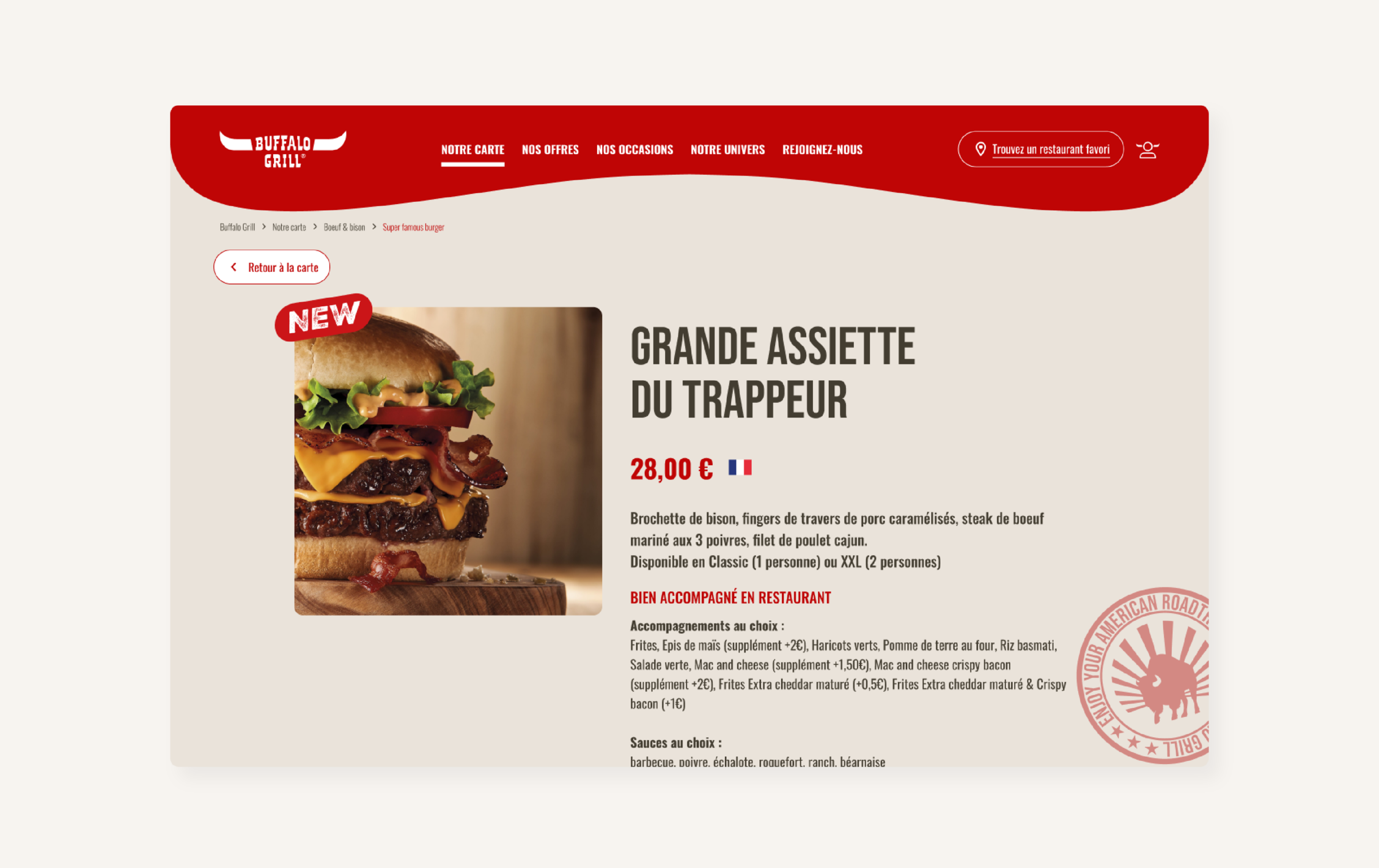 At UserAdgents, I took part in the redesign of Buffalo Grill’s website as a UI designer. Working alongside the lead UI designer, my role was to visually translate the brand’s new identity, inspired by the American Wild West, into a clear and engaging interface.